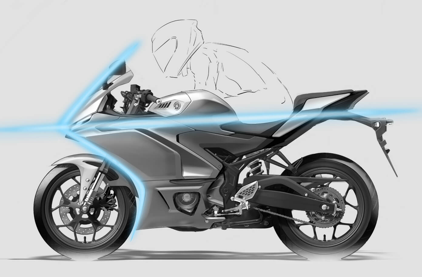 ノーズ先端からテール後方に貫く水平基調の造形軸を中心に、フロントカウルのS字シルエットを組み合わせたサイドビューがスピード感を表現。インテグレート・ウィングレット、テールウイング、大胆なヒートアウトレットといった空力デバイスを効果的に配置することで、スポーツマシンらしい佇まいを演出。フロントフェイスは無機質かつ知的な「睨み目2眼」の印象を与える 4 エレメントポジションランプを採用。ヤマハレーシング最高峰マシン・YZR-M1からRシリーズに継承されるフロントノーズのM字インテークと共に、クールな印象を醸し出す。